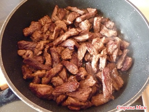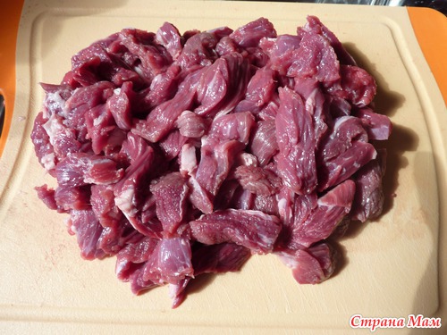 Мясо нарезать небольшими кусочками.
