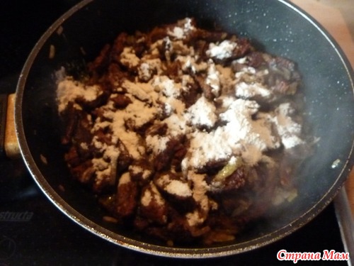 Посыпать сверху мукой, перемешать, слегка обжарить (буквально пару секунд),