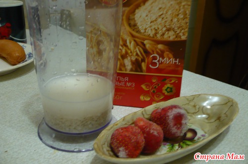 Утром геркулес с водой пробить блендером. Все процеживаем, добавляем сахар и ягоды, еще раз пробиваем и можно пить.