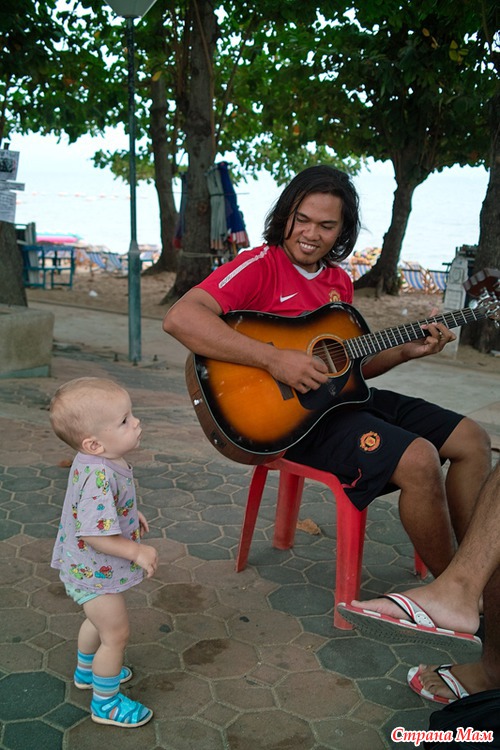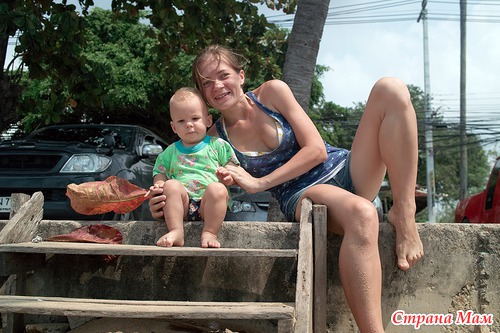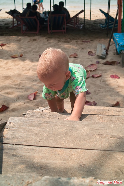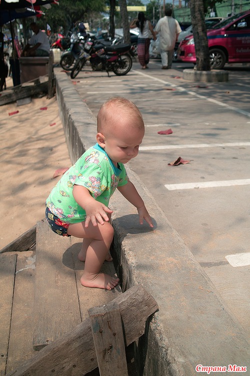 Да, на первые дни в кондо у нас сложился своеобразный распорядок – подъем, завтрак, бассейн, сон, обед, а потом пешая прогулка куда-нибудь. Красота!.. Однако знаете, даже каждодневный бассейн со временем стал восприниматься как поход на работу. ))) И мы начали вносить разнообразие – выбираться утречком на пляж. Не купались, если грязно, так хоть в песке дети играли… точнее, нет, играл один. Наш напарник. Макс насыпал пару вёдер – и бегом в странствия. Сначала были просто прогулки туды-сюды, которые быстро переросли в бэйби-паркур: ребёнок взбирался по вымощенным горкам наверх к пешеходным дорожкам и быстро бежал с горки, доводя меня каждый раз до микроинфаркта (ибо он только ходить научился, а тут – бежать, да ещё и по брусчатке, да ещё и падать на колени голые, разбивать руки, ноги, совершать разные кульбиты… и всё же прямо там, на совсем не чистом тротуаре!!!), сначала я мысленно тряслась над каждой царапиной, и постоянно надевала сандалии, когда деть норовил сбежать с пляжа на брусчатку. Но потом уже махнула рукой... В результате, большую часть времени ребёнок шарахался босиком, уводила я его только от битого стекла, слава богу, попадалось оно не часто. Благодаря этим покатым мощёным набережным у Макса появился новый пунктик из-за "бугра" – горочки! (теперь надо не только исходить все лестницы, но и обегать все горочки)