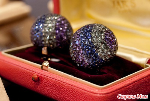 Пара клипсов "Шаров" с бриллиантами и разноцветными сапфирами от JAR, купленная в Париже в декабре 2001 года. Этот комплект был изготовлен на заказ знаменитым ювелирным дизайнером Жоэлем Артуром Розенталем (известным под инициалами JAR), который имеет маленький бутик на Вандомской площади в Париже, попасть в который можно только по предварительной записи. Для изготовления этих особых сережек, JAR использовал сапфиры разных оттенков, чтобы передать трудноуловимый фиалковый оттенок глаз Элизабет.