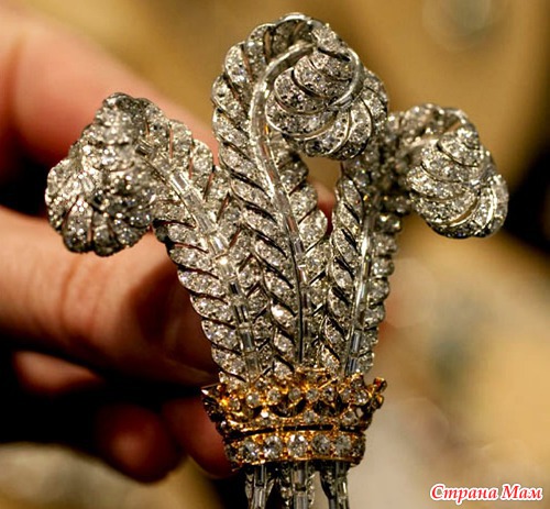 Брошь принца Уэльского. Брошь с бриллиантами, изготовленная около 1935 года, из коллекции украшений герцогини Виндзорской, купленная Элизабет Тейлор на аукционе в апреле 1987 года.