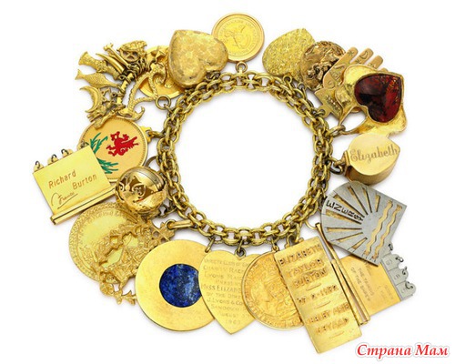 Браслет с 20 брелоками. С юношества до зрелого возраста Элизабет Тейлор собирала брелоки для многих своих браслетов. Собранные вместе 5 браслетов с брелоками представляют настоящую автобиографию, ведь каждый брелок раскрывает частичку личной истории своей обладательницы. Один из этих браслетов может похвастать двадцаткой брелоков, включая гравированный нумератор с хлопушкой в память об "Укрощении строптивой", ювелирную лупу с именем "Элизабет", и, наверное, самый трогательный из всех брелоков – золотой фермуар в форме сферы с четырьмя медальонами внутри, на которых написаны имена и даты рождения каждого из ее четырех детей.