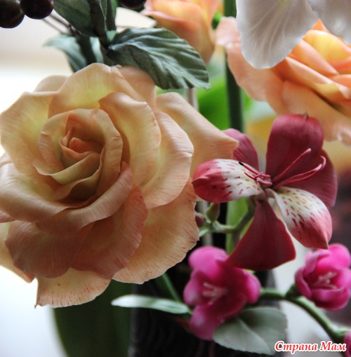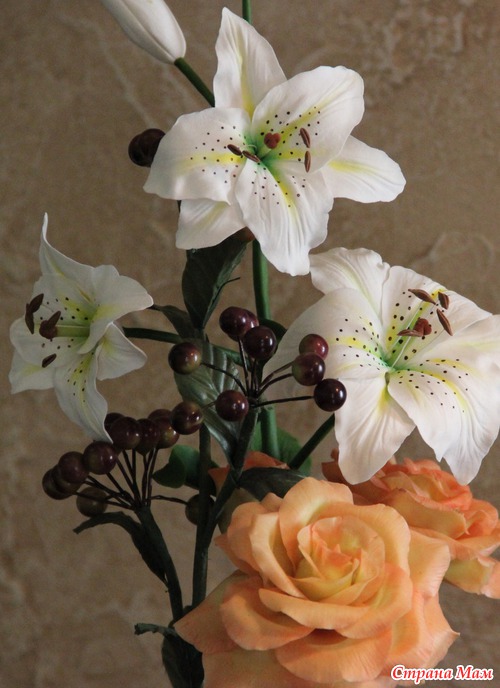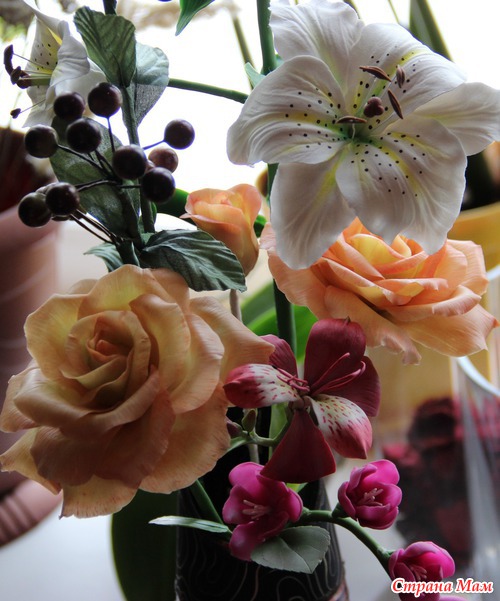 Роза сама по себе хорошая. Мне правда не нравится серединка у нее. Вижу как кусочек глины там. То есть не бутон, а именно как кусок. Может я ошибаюсь, и вижу не то что есть на самом деле. Цвет розы мне не нравится. А вернее ее тонировка. Муж бы ее назвал "как будто запачкали" Вот у меня тоже такое впечатление. Лучше в начале лепестков делать более темнее цвет. Не растушевая слишком сильно. Затем от темного цвета растушевывать другой кисточкой дальше.Будет 2 перехода цвета. Один темнее другой светлее. Ягодки замечательные! Лилия мне тоже понравилась! Остальные цветочки тоже хорошенькие. Молодец.