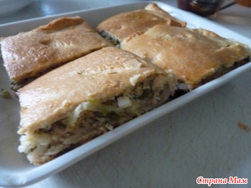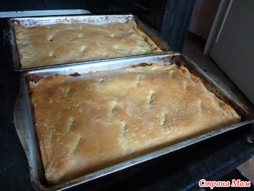 Раскатала пласт, на его половину начинку, на противень и накрыть второй половинкой, защипала и смазала молоком с сахаром)Вот, что вышло))