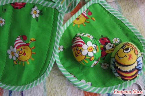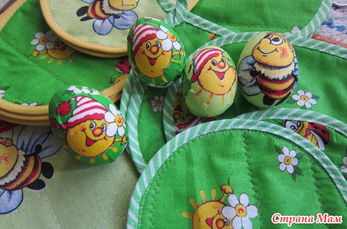 Нинче кроила прихватки из веселенького ситчика. И такие мордашки у самой кромки, что рука не поднялась в мусорную корзину выкинуть. Решила продолжить свои эксперименты с пасхальными яйцами.