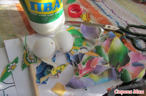 Клей ПВА, лоскутки и скорлупа от яци ( полученная методом выдувания и яичнице-омлето поеданием
