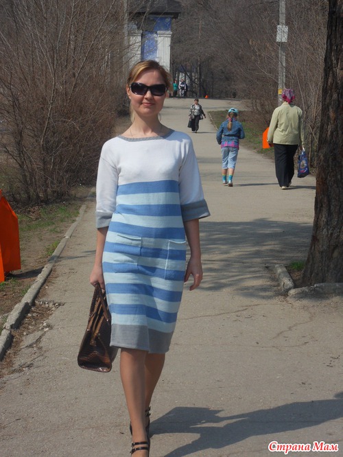 Спрашивала я совета у страномамочек какой расцветки платье вязать. В результате остановилась на голубой гамме, и вот что получилось: вчера первый день выгуляла его.