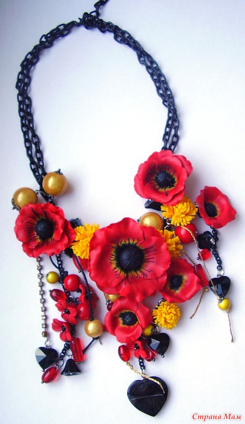 Мне очень нравится сочетание маков и фурнитуры. Ну скажи , как возникла идея добавить одуванчики? Их не так часто используют для создания такой росскошестой вещи.