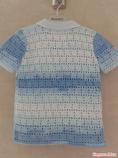 для себя отметила недочеты: чуть узковата горловина (на следующей сделаю пошире), не очень хорошо получилось подобрать полоски цвета на спинку и пуговки хочется заменить (футбольные мячики, голубые с белым... жду, заказала по инету)