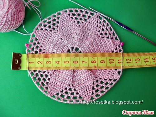 Оно состоит из 11 рядов (Кольцо цепочки из 10 в. п. – это 0й ряд). 12-й ряд – ССН (столбики с накидами) в каждую петлю предыдущего ряда, здесь уже прибавлений нет.
