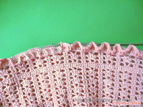 2-й ряд рюши вяжем следующим образом. Начинаем ряд с 3-х ВП подъёма, *1ССН, 1 петлю предыдущего ряда пропускаем,1ВП* повторяем от *до*
