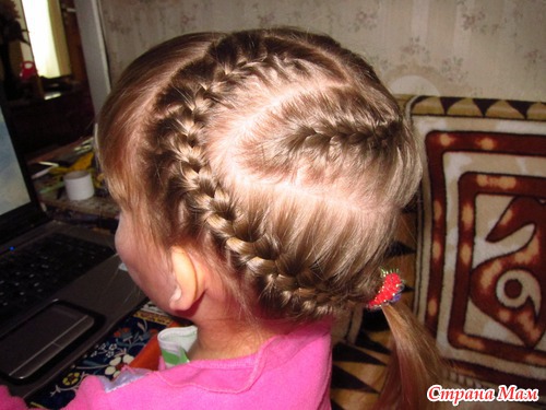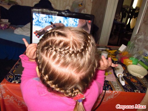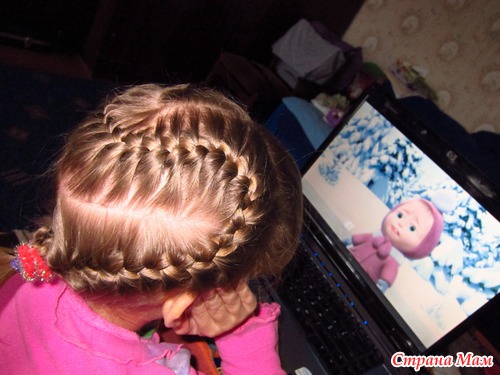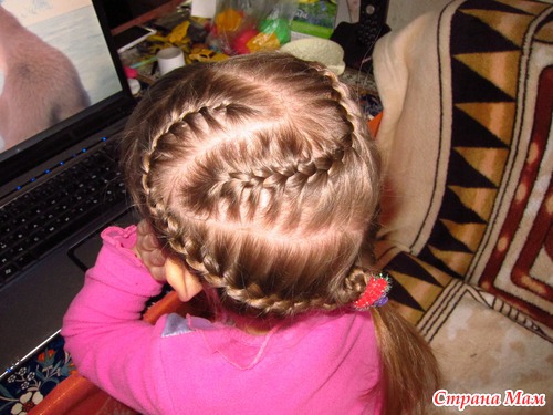 Разделила волосы пополам (вдоль). Потом от макушки отделила полоску вдоль лба к виску и начала с макушки плести колосок. Доплела до виска, зафиксировала временно. Отделила полоску, которая под колоском, и продолжила ее на правую часть головы вдоль лба до другого виска - получилась дуга "вогнутая". Первый колосок продолжила плести вдоль контура волос вниз слева - как вопросительный знак, только в другую сторону. Затем начала плести другой колосок слева направо - до виска, а потом, как первый вдоль контура волос справа вниз. Не понятно? сверьте с фото.