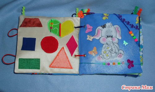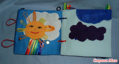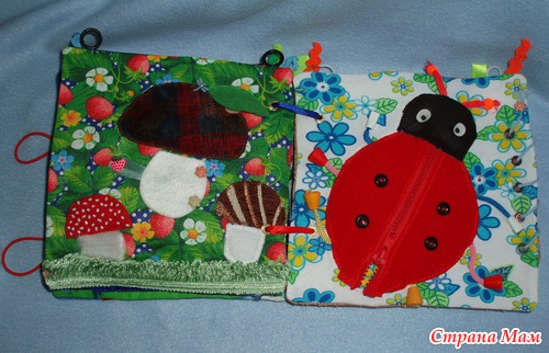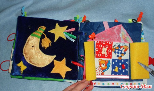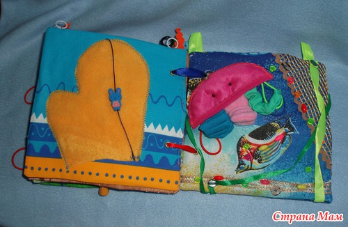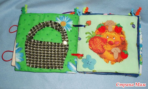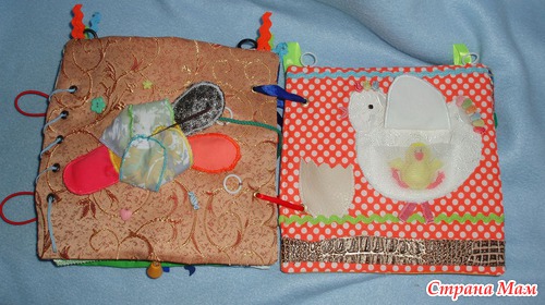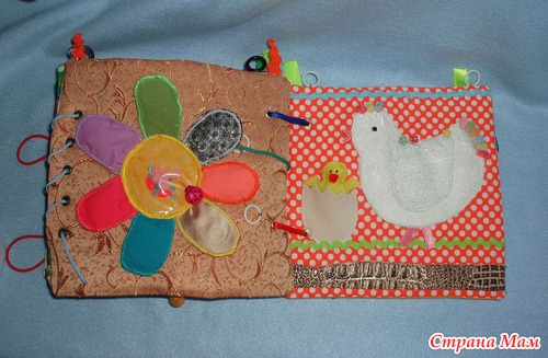 Для малышки есть вверху страничек колечки для подвешивания в кроватку, для старшего шнуровки, застежки, игровые странички.