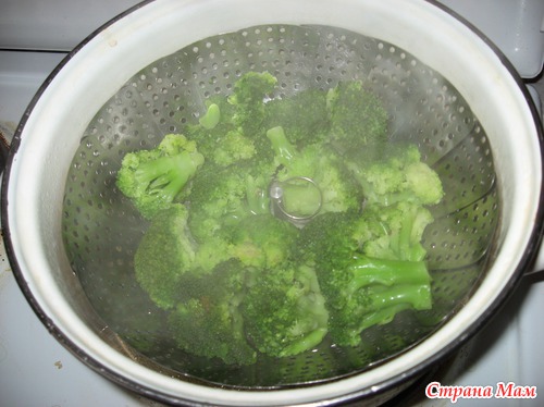 Брокколи отварить на пару минут 10-15 (у меня около 400 грамм замороженной было)