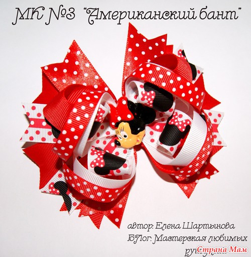 Ленты сложить по середине и отметить эту середину, можно ручкой в виде точки и собрать на иголочку нанизывая в том порядке как на фото снизу вверх: крест на крест две красные, посередине красная, между красными ленту с рисунком "минни" и в последнюю очередь верхними ленту в горох.