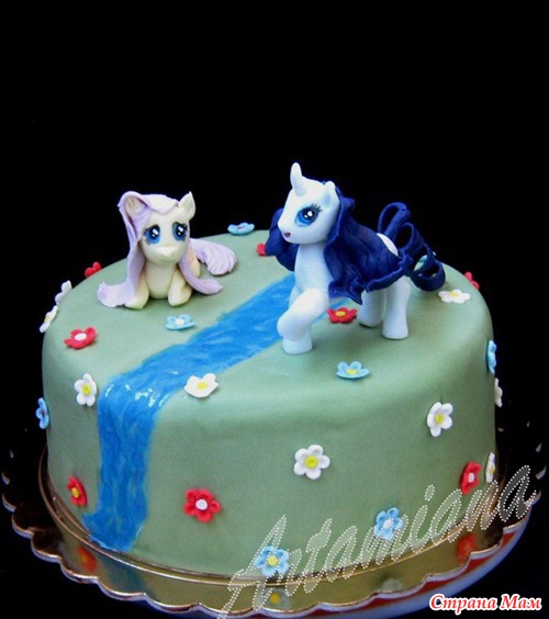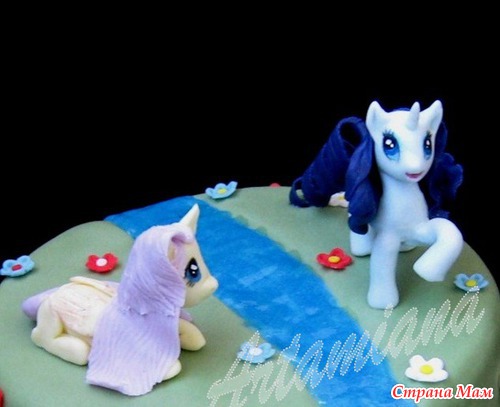 1. Торт "Пони у речки" Вес 3,1 кг. Внутри вишневый масляный бисквит и сырный крем с вишней. Под мастикой - ганаш. Оформление - мастика покупная (Каллебаут) и декор-гель. Фигурки - мастика "Офигительная".