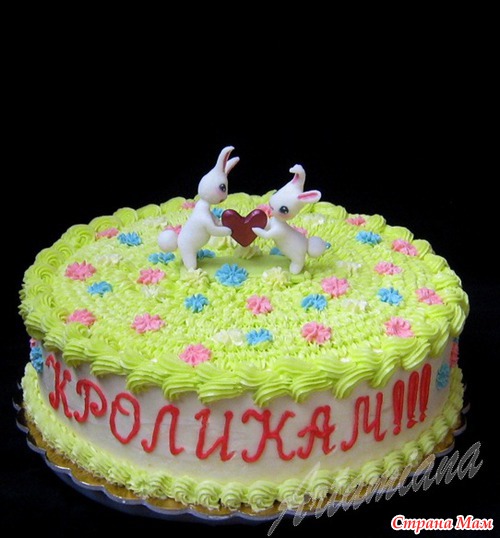 2. Торт "Заячья полянка". Вес 2,7 кг. Внутри торт "Наполеон" с масляно-заварным кремом. Оформление - масляный крем. Фигурки - мастика на желатине.
