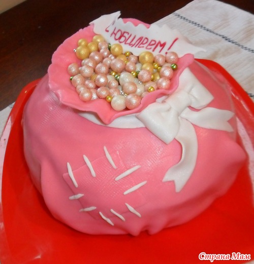 Ну а этот тортик попросила сделать мама для своей коллеги, сказала сделать, чтоб было красивенько и чтоб не слишком я заморачивалась и вот решили сделать такой женский мешочек с жемчужинками. Внутри медовик, крем заварной на сгущ. молоке, вес не знаю.