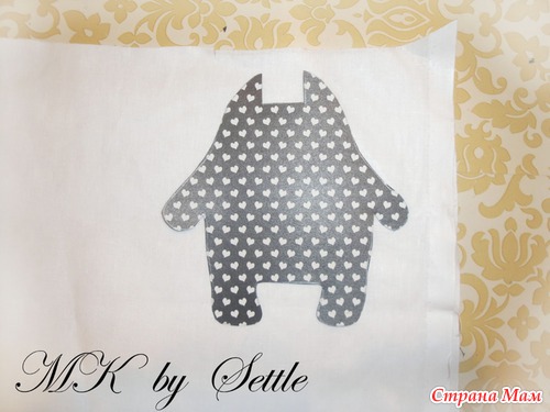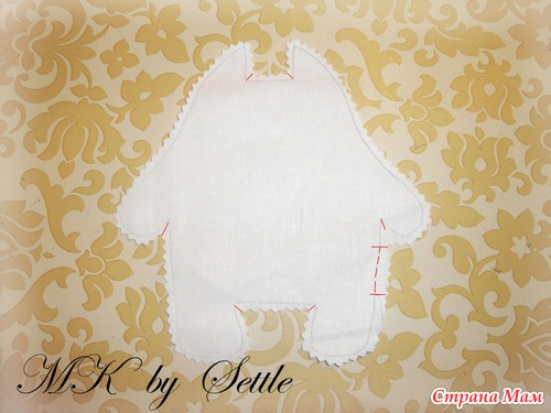 Теперь надо прострочить котика по контуру на швейной машине. Не забудьте оставить небольшое отверстие, чтобы можно было вывернуть и набить игрушку наполнителем.