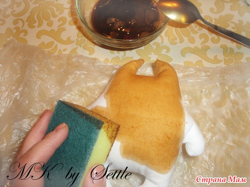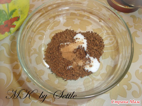 Для тонировки берем 2 ложки растворимого кофе, щепотку корицы, немного ванили и полторы ложки клея ПВА. Все это заливаем небольшим количеством кипятка и тщательно размешиваем.