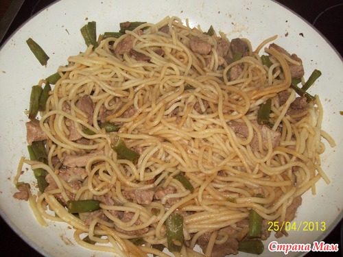 В кастрюле или глубокой сковороде, разогреть масло обжарить зел фасоль и мясо в течении 2-х мин, добавить солъ, сахар, вино, немного соевого соуса и около половины зеленого лука. перемешатъ, добавить немного 2-3 ст л0жки бульона и немного потушить. когда все будет готово, переложить лапшу на мясо полить соусом немного еще прогреть, посыпать зеленым луком.