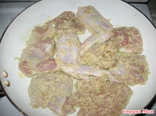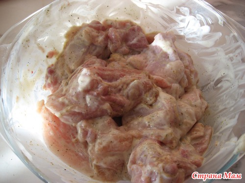 Куриное мяско (грамм 400-450) порезала на кусочки.. посолила, поперчила и добавила баночку натурального йогурта.. перемешала и оставила часа на 2..