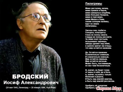 Бродский Иосиф Александрович (24 мая 1940, Ленинград — 28 января 1996, Нью-Йорк) — выдающийся советский и американский русский поэт, русский и английский эссеист, драматург, переводчик, лауреат Нобелевской премии по литературе 1987 года, поэт-лауреат США в 1991—1992 годах.