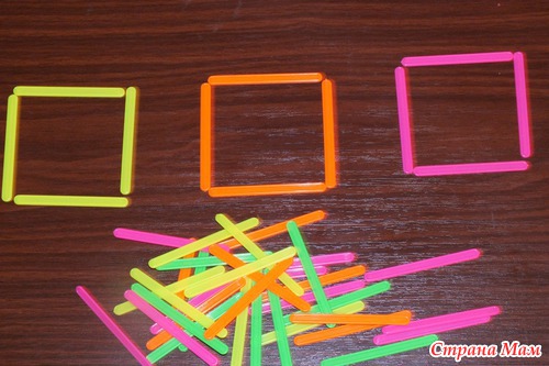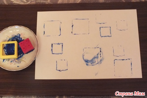 Квадратики мы выкладывали из счетных палочек. Это занятие очень понравилось моему сыночку. Чего не скажешь о рисовании квадратов по манке. Попробовав пару раз, Андрей вновь начал рисовать круги, которые ему так полюбились на прошлом занятии. Фотографировать не стала. Круги, так круги. Повторение - мать учения!