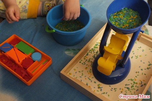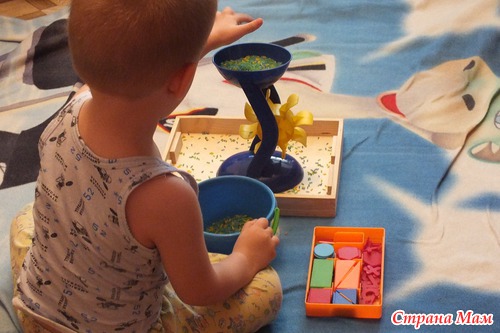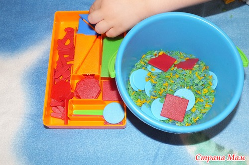 Поискали квадратики в сенсорной коробочке. В этот раз Андрей решил, что сенсорным должно быть непременно ведерко. Внес свои правила, подключив в игру мельницу.