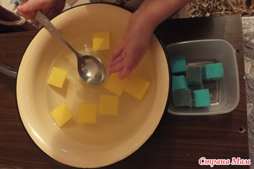 Занятия с водой доставляют нам особую радость. Решила порадовать сыночка. Выжимали губки прессом и вылавливали ложкой квадратики.