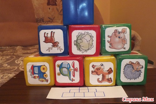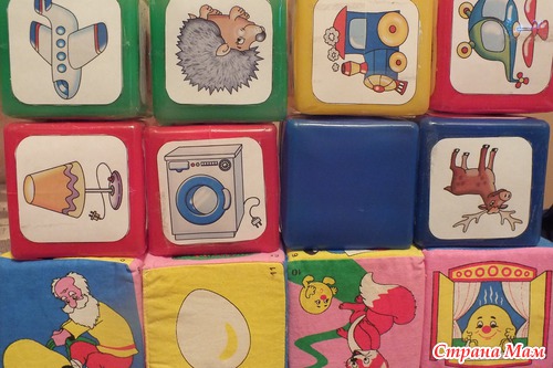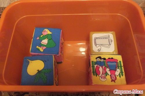 С кубиками можно придумать много игр. Вот что понравилось нам. Прыгать через преграды, собирать в корзину разбросанные кубики, сбивать башни из кубиков мячом или бросив в них другим кубиком, бросать кубики с расстояния в коробку.