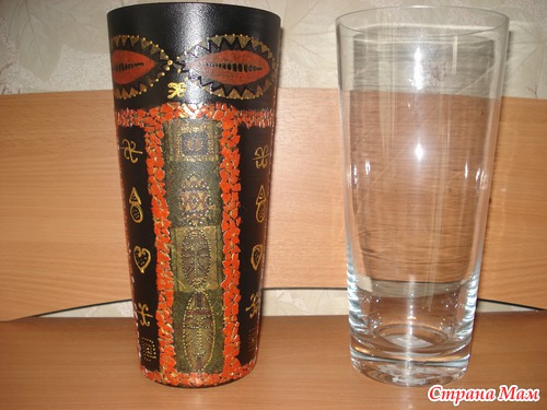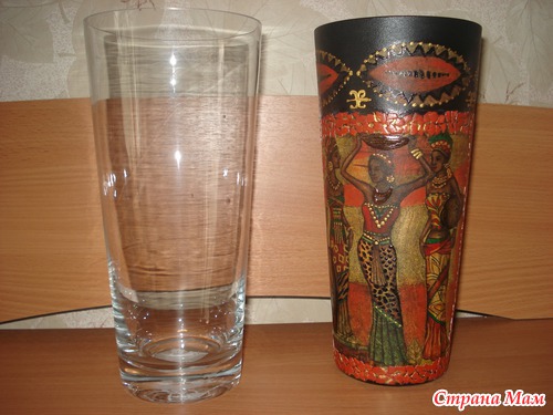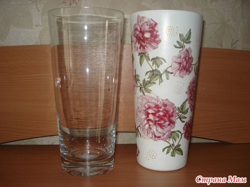 Как Вы уже поняли слева ваза до... и справа после, декупаж делала салфеткой, вырезала отдельные мотивы, потом приклеивала.
