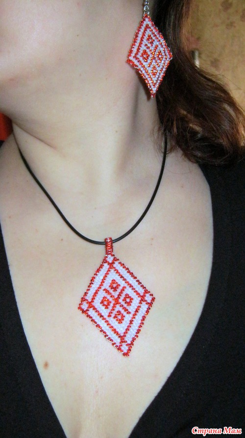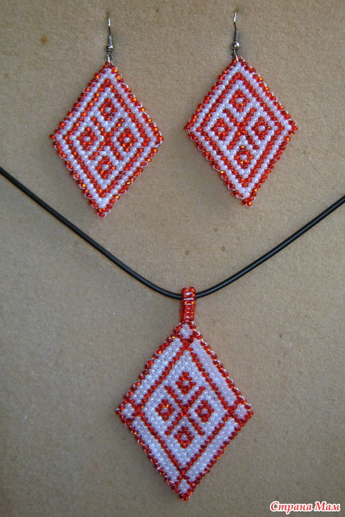 Кулон и серьги с символикой славянской богини Макошь - Небесной Пряхи. Делались ка оберег для себя, любимой. Схемы мои.