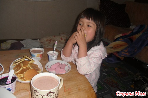 Семь утра, мы с мужем встали, Мио решили пока не поднимать, что б ни мешалась. Но вскоре я услышала шаги по лестнице - деть не мог упустить шанса провести утро с папой - обычно он уходит в это время, но в тот день взял полдня отгула. Завтрак легкий, но вкусный - оладушки с вареньем.
