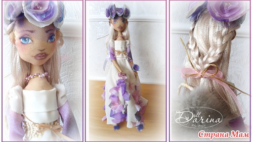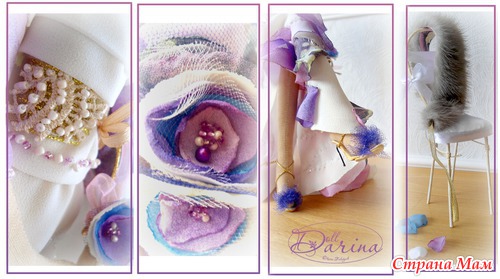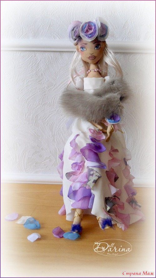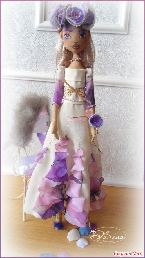 Когда я начинала её делать, то мне хотелось, чтоб это была девушка из красивых 20х годов. Для этого я выбрала пурпурный цвет, он всегда был и есть знаком роскоши. К нему в гармонии идут лиловый, беж и золото.
