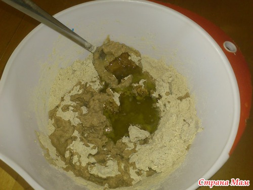Хорошенько вымешиваем. Должно получиться достаточно крутое тесто приятного коричневого цвета (это из-за гречневой муки):
