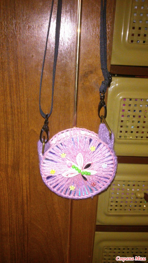 У нас очень много дисков не нужных (уже) и Яна очень хорошо ими играет, мы с ней используем их как подставки для пластилиновых изделий, а еще я их обвязывала и делала из них подставки для горячего (как нибудь покажу фото), один диск да же пошел на подставку для бижутерии https://www.stranamam.ru/post/3348912/#com20899261. Ну, а в этот раз, я решила сделать сумку из обвязанных дисков, декорировала бусинами, цветком из фетра и сделала бабочку (мою первую бабочку) из лент в техники канзаши, ручку мне Яна до делать не дала, так что я просто взяла готовую от чехла цифрового фотоаппарата.