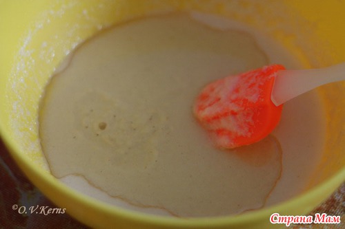 Муку смешать с разрыхлителем, просеять и добавить в миску. Тесто должно быть по консистенции густой сметаны.