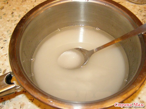 Растворяем сахар в воде и ставим на огонь. Варим сахарный сироп, вам понадобится минут 5