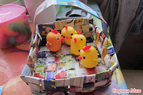 А пока это все отвердевало, мы попробовали сплести из бумажных полосок корзинку.