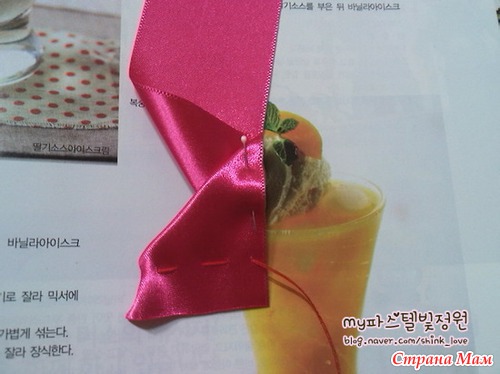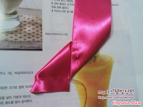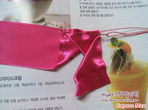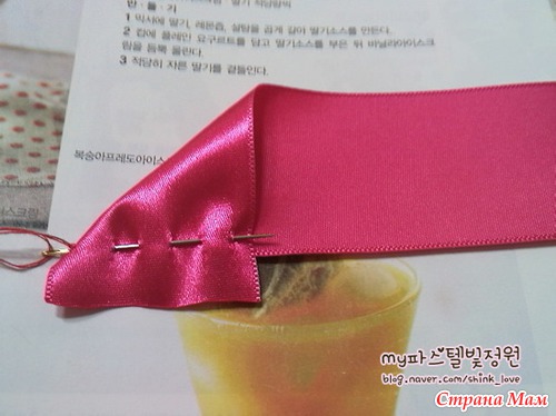 При помощи иголки и нитки мы начнем по особому закреплять углами нашу ленту.