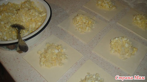 Разрезаю на квадраты, выкладываю начинку рис+ яйцо(классика жанра + зеленый лук, но я его не люблю..).