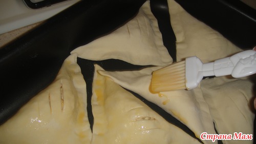 Края смазываю водой, "квадраты" складываю в " треугольники", смазываю яйцом.