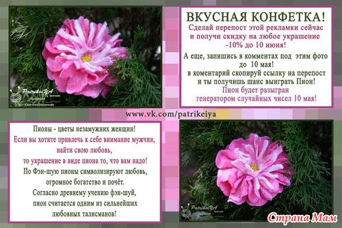 На этот раз конфеткой будет цветочек ПИОН созданный мной из шерсти методом мокрого валяния! Вся инфа на рекламном фото!конфетка будет разыграна 10 мая! Не упусти шанс!!!