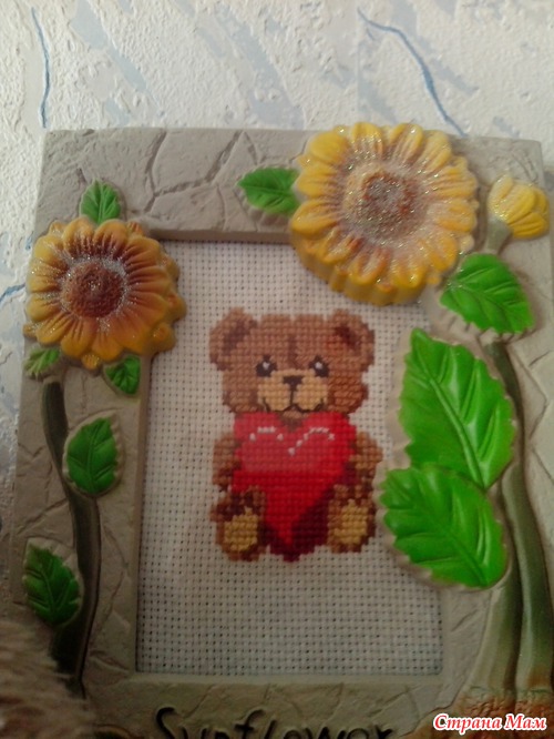Первым набором, который попался мне в руки, оказался мишка от Искусницы. Вышивала "как умела"