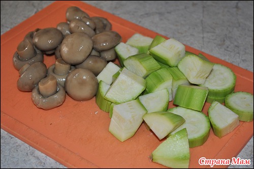 Кабачок нарезаем кубиками, шампиньоны берем консервированные целые.