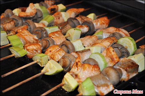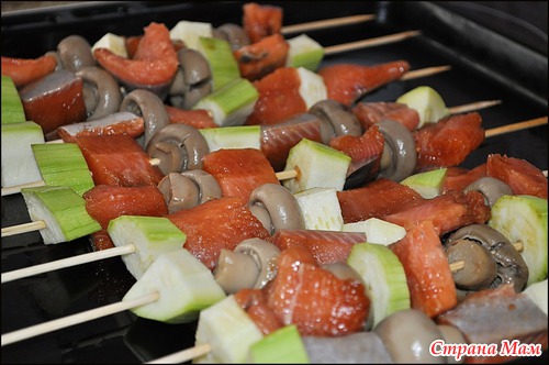 Ну, и нанизываем на шпажку: рыбу, кабачок и грибы. Выкладываем на смазанный маслом противень.