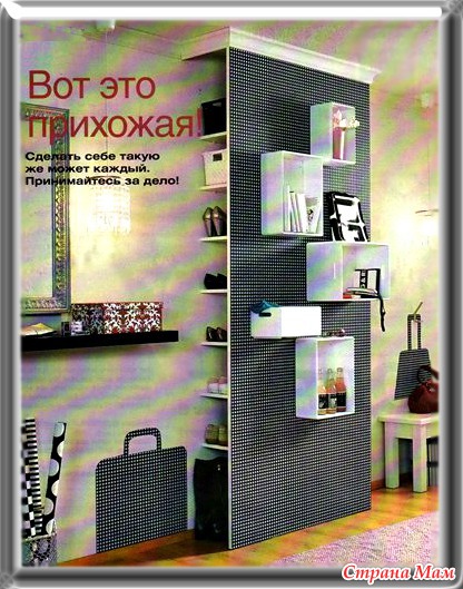 Представьте себе вы входите, снимаете пальто, уличную обувь и все это исчезает за вот такой замечательной панелью собственного изготовления, с одной боковой стороны панели расположены полки для обуви с другой штанга для пальто. Спереди на панели прикреплены ящики для различных мелочей. А из остатков обоев вырежем силуэт чемодана и сумки, приклеим их к стене, в качестве украшения.