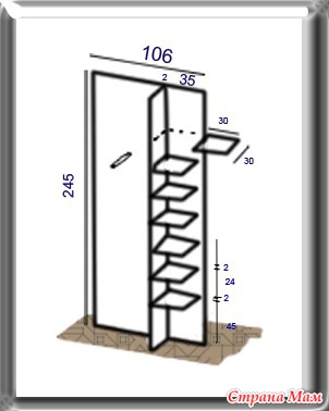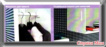 Переднюю панель положить на пол и прикрепить к ней уголкам заднюю разделительную стенку, в образовавшийся угол при помощи саморезов установить полки. Конструкцию поднять и прикрепить уголкам к стене и полу. Полки также прикрепить к стене. Установить на держателях штангу для пальто. Все видимые части конструкции покрыть белым акриловым лаком. Переднюю панель оклеить обоями и прикрепить ящики для мелочей, на верху сделать обрамление из полиуретанового профиля.